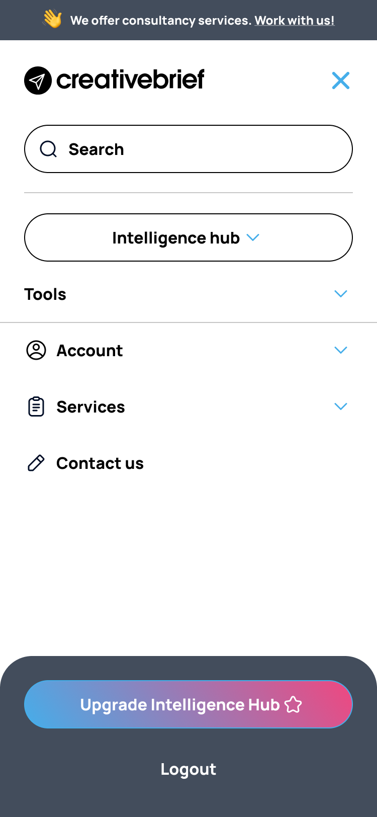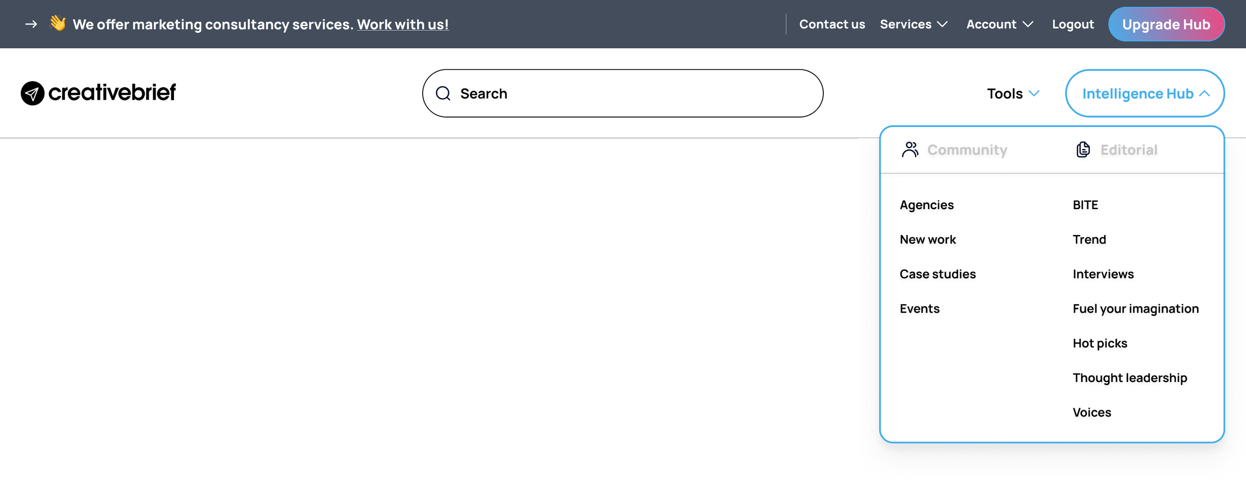 Creativebrief’s header navigation serves as the digital welcome mat for visitors across various industries, including marketers, agency teams, and freelance creatives. The project was simple: refine the desktop and mobile header navigation to align with industry best practices, while reinforcing Creativebrief’s brand identity and making navigation simple, intuitive, and accessible to showcase their marketing consultancy service and insights product portal..